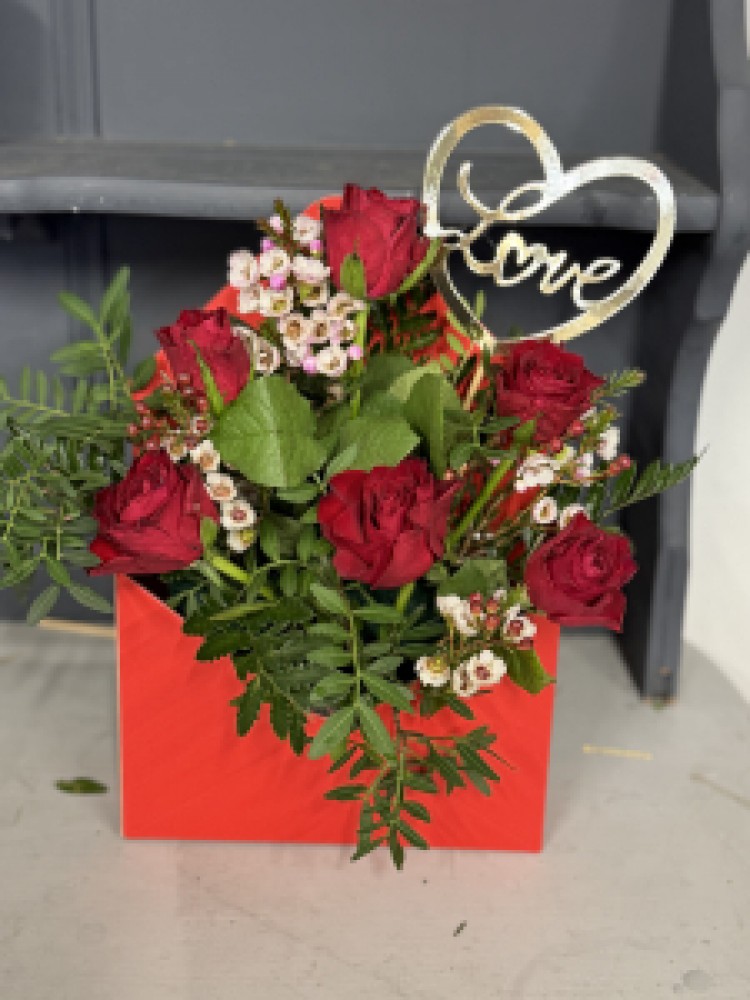Beautiful valentines rose arrangement in envelope. PS I love you.